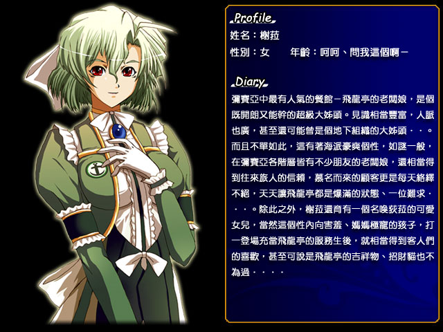 彌賽亞中最有人氣的餐館——飛龍亭的老板娘,是個既開朗又能干的超級大姐頭。見識相當(dāng)豐富,人脈也廣,甚至還可能曾是個地下組織的大姐頭……而且不單如此,這有著海派豪爽個性,如謎一般,在彌賽亞各階層皆有不少朋友的老板娘,還相當(dāng)?shù)玫酵鶃砺萌说男刨?,慕名而來的顧客更是每天絡(luò)繹不絕,天天讓飛龍亭都是爆滿的狀態(tài)、一位難求……除此之外,榭菈還育有一個名喚荻菈的可愛女兒,當(dāng)然這個性內(nèi)向害羞、媽媽極寵的孩子,打一登場充當(dāng)飛龍亭的服務(wù)生之后,就相當(dāng)?shù)玫娇腿藗兊南矚g,甚至可說是飛龍亭的吉祥物、招財(cái)貓也不為過……