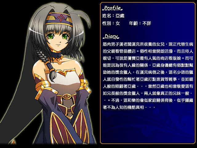 筋肉男子漢老板漢克所收養(yǎng)的女兒,現(xiàn)正代替生病的父親看管晶體店。個性相當(dāng)開朗活潑,而且待人親切,可說是彌賽亞另一具有超人氣的商店看板娘。而可能是因?yàn)楹苡腥司壍年P(guān)系,亞歲身邊總有個默默幫助她的獎金獵人,在漢克病倒之后,這名少語的獵人就自發(fā)性地幫忙著亞歲打點(diǎn)進(jìn)貨等雜事,并如親人般地照顧著亞歲……當(dāng)然亞歲也相當(dāng)敬愛這有如兄長般的獎金獵人,兩人就像真正的兄妹一般……不過,這和樂的像似家庭關(guān)系背后,似乎隱藏著不為人知的殘酷真相……