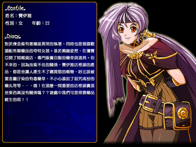 對于煉金術(shù)有著極度異常的執(zhí)著,同時也是個喜歡調(diào)配各類藥品的奇特女孩?;谂d趣使然,在彌賽亞開了間雜貨店,專門販賣自制的藥草與道具。但不幸的,因?yàn)榧夹g(shù)不佳的關(guān)系,賽伊雅店里頭的產(chǎn)品,都是些讓人產(chǎn)生不了購買欲的雜物,好比說被重金屬污染的有毒藥草、不小心添加了詛咒成分的藥丸等等……