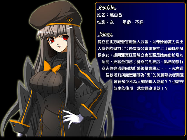 獨(dú)立在北方經(jīng)營冒險(xiǎn)獵人公會,以奇妙的實(shí)力與出人意外的迫力(?)將冒險(xiǎn)公會事業(yè)推上了巔峰的謎樣少女。據(jù)聞彌賽亞冒險(xiǎn)公會甚至是她商借給塔莉所開,更甚至包含了魔恩的刻紋店,凱蒂的旅行商店等等皆是由她所幕后投資設(shè)立……究竟這個被塔莉和魔恩稱呼為“鬼”的美麗幕后老板還會有多少不為人知的驚人能耐??也許在故事的后期,就會逐漸明朗???