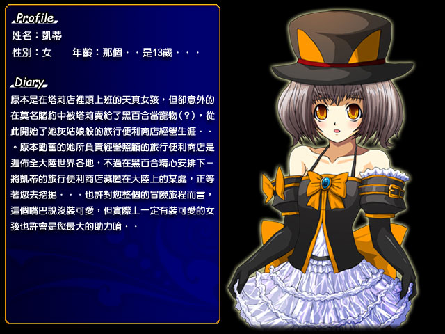 原本是在塔莉店里頭上班的天真女孩,但卻意外地在莫名賭約中被塔莉賣給了黑百合當(dāng)寵物(?),從此開始了她灰姑娘般的旅行便利商店經(jīng)營生涯……原本勤奮的她所負(fù)責(zé)經(jīng)營照顧的旅行便利商店是遍布全大陸世界各地,不過在黑百合精心安排下——將凱蒂的旅行便利商店藏匿在大陸上的某處,正等著您去挖掘……也許對您整個的冒險(xiǎn)旅程而言,這個嘴巴說沒裝可愛,但實(shí)際上一定有裝可愛的女孩也許會是您最大的助力唷……