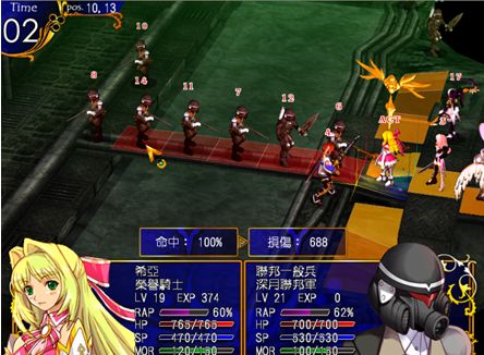 在臺階頂了把希亞的攻擊調(diào)整至最高,再用鼓舞把斗志升至120,用鳳凰破天式,把小兵全滅,剩下八月很難在一回合內(nèi)滅了,梅魯下去扔顆失力粉,她反應(yīng)值也挺高,所以只能把她打?qū)⒔话胙@樣她就不會使出那招“穿魂魔彈擊”了,下回合滅她還是很輕松的……一周目的圖,難度容易呵呵
