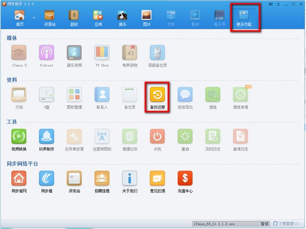 一、越 獄 須 知1.刷機和越獄前請注意做好數(shù)據(jù)備份,以便出現(xiàn)異常時能恢復數(shù)據(jù)。為保險起見,推薦使用iTunes和同步助手各備份一次。同步助手備份:運行同步助手切換到“更多功能>>備份還原”可創(chuàng)建新的備份。