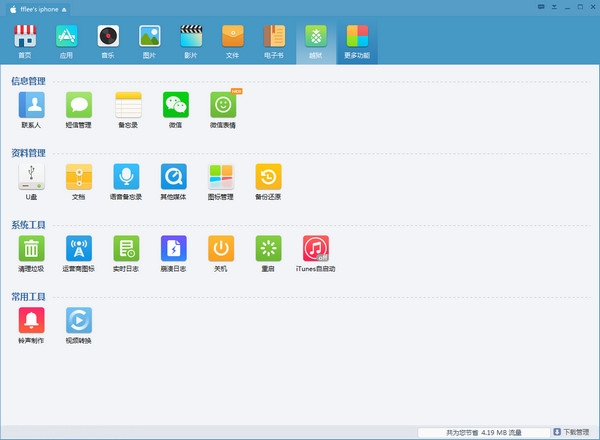 同步助手-是一款在電腦上使用的iOS/Android設(shè)備管理工具。輕松備份微信聊天記錄、管理微信表情、桌面圖標,支持短信/聯(lián)系人/圖片/鈴聲導入導出,還有個性化運營商圖標修改等功能。海量應用、游戲、壁紙、鈴聲高速下載。界面簡潔,功能強大,操作簡單,暢爽體驗!