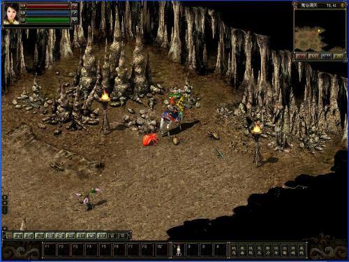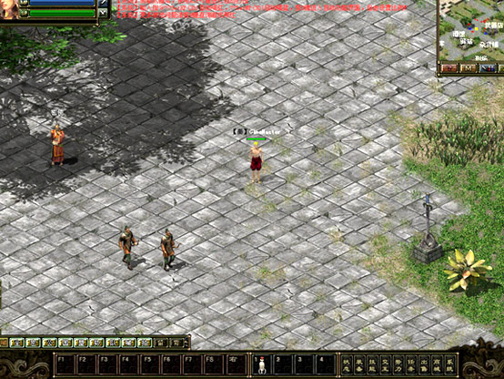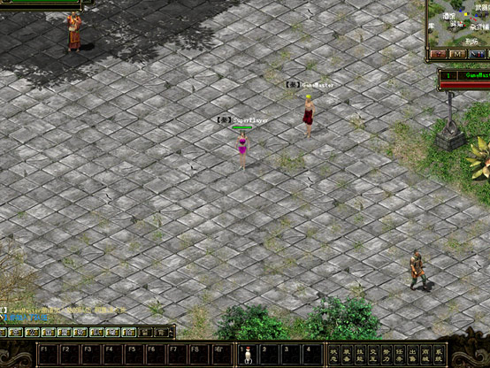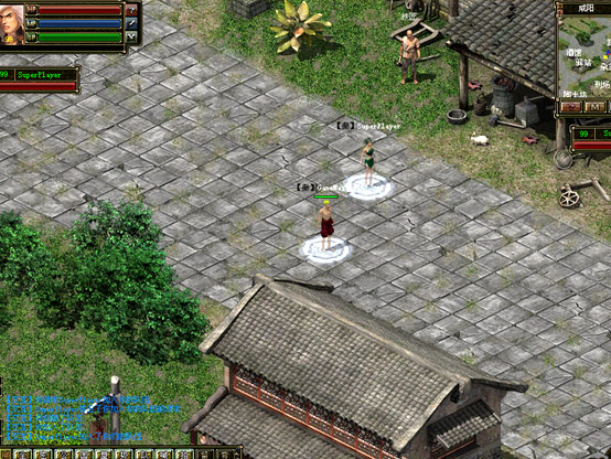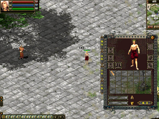 右上角為游戲小地圖;左上角頭像旁邊由上至下依次是,紅色生命槽,藍(lán)色體力槽,綠色潛能槽; 左下方為信息顯示窗口;右下方標(biāo)記著狀態(tài)、物品等為游戲功能菜單;窗口正下方F1-F8為技能欄,標(biāo)記著“右”字的為當(dāng)前使用修煉的主動(dòng)技能;