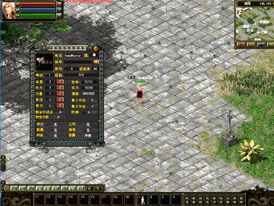 界面的左上角是人物頭像位置;界面右上方顯示了人物的簡(jiǎn)單信息,包括:角色名稱、國(guó)籍、綽號(hào)、等級(jí)、經(jīng)驗(yàn)值等;界面下方顯示了角色的其它信息,包括各項(xiàng)屬性、升級(jí)點(diǎn)以及社會(huì)關(guān)系等角色身份信息; 其它說(shuō)明: 國(guó)籍代表了你所選擇的國(guó)家;綽號(hào)是你在游戲中外號(hào),可以自行修改,點(diǎn)擊其右邊的按鈕即可, 戰(zhàn)功代表你對(duì)自己國(guó)家的貢獻(xiàn)值,以后升官、做任務(wù)需要它。體質(zhì)影響生命,內(nèi)力影響體力,力量和攻擊有關(guān),身法影響命中和防御,如果你想練謀士的話,對(duì)智力就有要求。 右邊就是生命、體力、最小攻擊、最大攻擊和當(dāng)前防御值了。