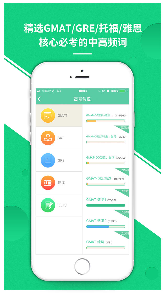 1、精選考試高頻詞匯:精選GMAT/GRE/托福/雅思核心必考的中高頻詞匯2、三大個性化記憶模式:艾賓浩斯記憶法(科學記憶)、復習記憶法(復習+記新詞)、快速記憶法(記新詞)