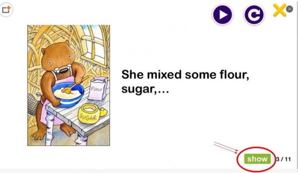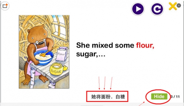 這個(gè)功能適用于初級(jí)的閱讀書目,從aa級(jí)到J級(jí)的每本書都具備這個(gè)功能。J級(jí)是美國二年級(jí)水平,達(dá)到這個(gè)水平之后,孩子都具備了一定的自學(xué)能力。那對(duì)于初學(xué)的孩子而言,怎么使用翻譯的功能呢?打開一本書后,下方有一個(gè)“show”圖標(biāo),點(diǎn)擊,就會(huì)出現(xiàn)中文翻譯,再點(diǎn)擊“Hide”,譯文就消失了。
