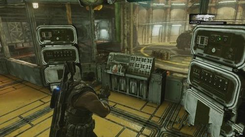 2.穿過倉庫來到停機坪前原來被卡住,無法上升,這個任務(wù)必然是我們來完成了.敵人大量從門內(nèi)沖鋒出來,躲避+射擊.二樓控制室內(nèi)打開升降平臺的開關(guān).