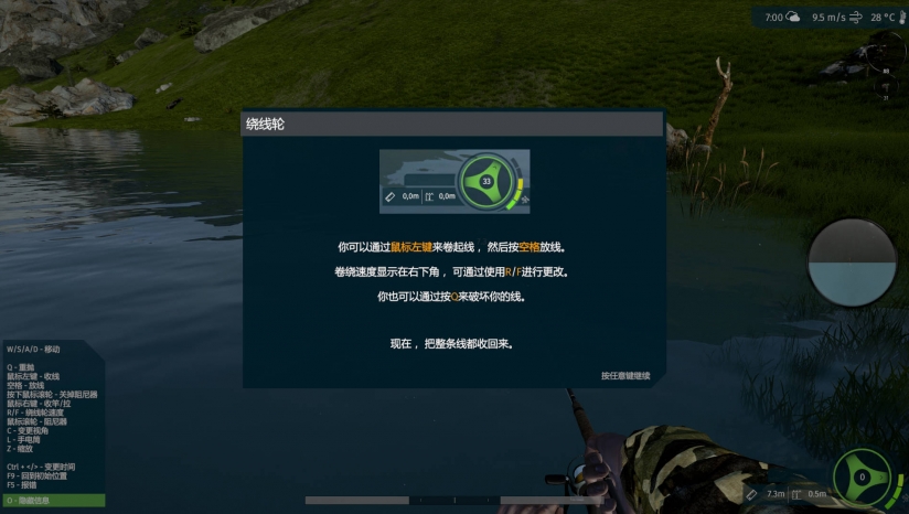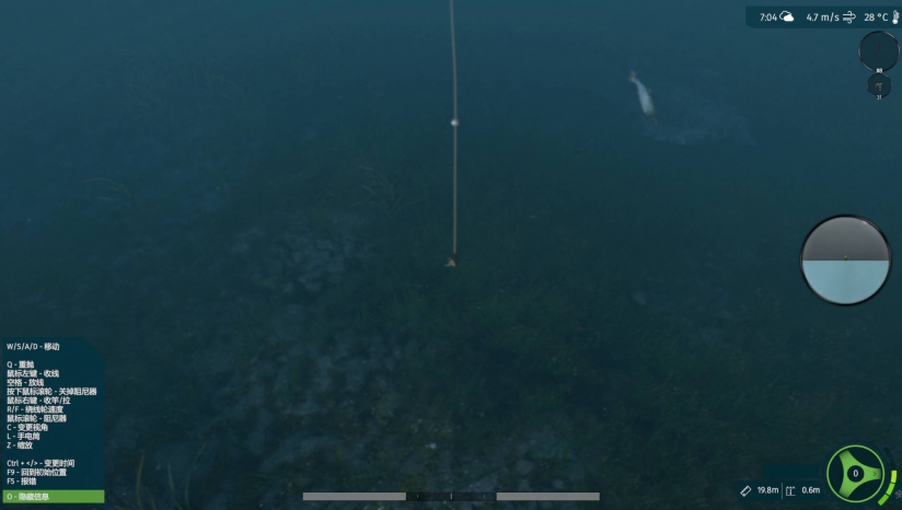 游戲中,鼠標(biāo)右鍵是拉魚(收線),左鍵是放線,大魚需要溜魚幾下