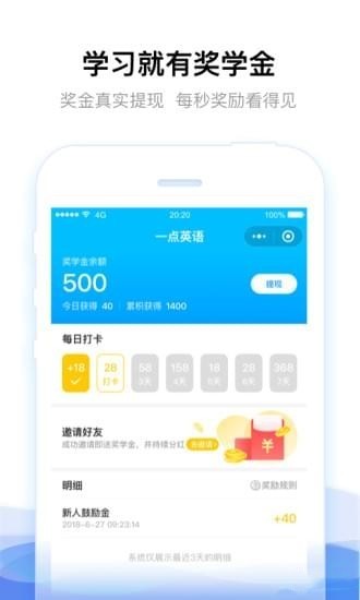新用戶登錄即有獎(jiǎng)學(xué)金紅包!同時(shí)在一點(diǎn)英語(yǔ)的學(xué)習(xí)過程中,隨著學(xué)習(xí)時(shí)間不斷增加,獎(jiǎng)學(xué)金也不斷累積,獎(jiǎng)學(xué)金可真實(shí)提現(xiàn)為現(xiàn)金哦!