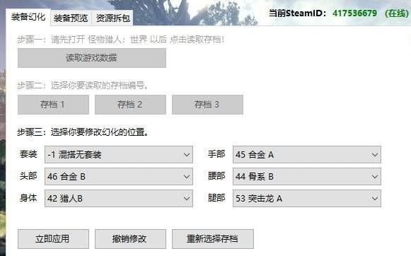 怪物獵人世界裝備幻化工具,可以在游戲中實(shí)時(shí)更改當(dāng)前主角的裝備形態(tài),即使穿的新手裝也可以改成各種后期裝備的外形,怪物獵人世界幻化工具涵蓋了游戲95%的裝備,聯(lián)機(jī)可用。