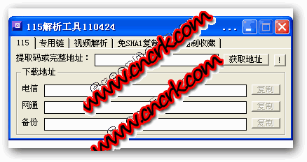 115解析工具最近115網(wǎng)盤上視頻資源被封鎖了,好多給力視頻都無法下載,于是popok自己編寫了一個(gè)115網(wǎng)盤地址解析工具。即使115下載頁面中沒有可用的下載地址,你也可以使用它來提取出直接下載地址,用于迅雷等下載軟件高速下載,當(dāng)然不僅是視頻資源,只要是115網(wǎng)盤資源都可以解析