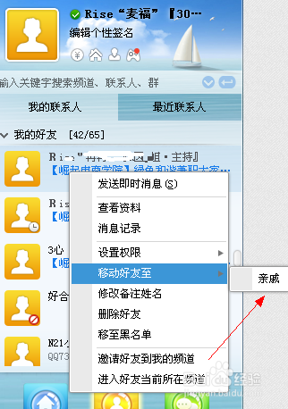 右鍵點(diǎn)擊你的好友會(huì)出現(xiàn)一個(gè)欄目框,點(diǎn)‘移動(dòng)好友至...’,箭頭所指的親戚。確定就好了