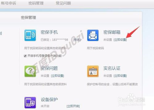 在打開的網(wǎng)頁中進(jìn)入密保管理,打開 密保郵箱,點(diǎn)擊 立即設(shè)置,