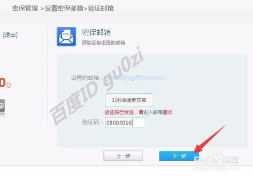 在通過手機(jī)驗(yàn)證后,進(jìn)入 密保郵箱的填寫,