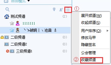 一、收藏頻道1、可在頻道內(nèi)點(diǎn)擊頻道樹房間列表后的更多按鈕,在彈出的菜單中點(diǎn)擊收藏頻道進(jìn)行收藏。