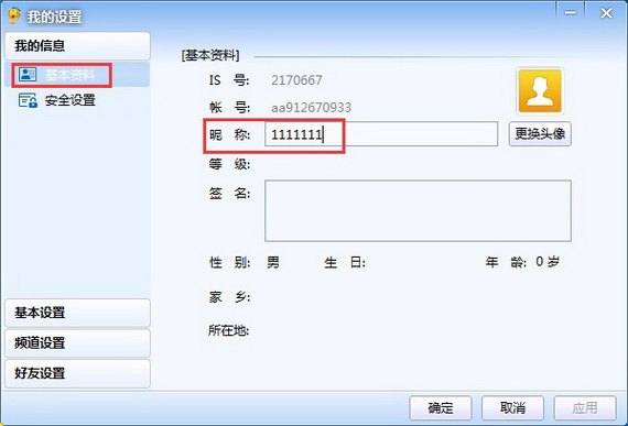 2、在基本資料-昵稱處,輸入新的昵稱,點(diǎn)擊確定即可。