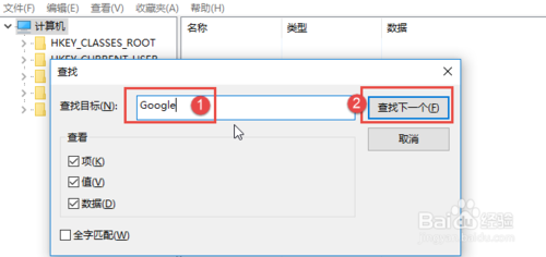 在查找目標中輸入關(guān)鍵字Google,然后點擊查找下一個。