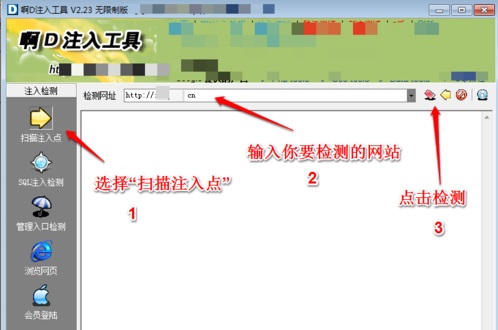 2、點擊軟件左邊的“掃描注入點”功能,在地址欄輸入需要檢測的網(wǎng)站地址,點擊地址欄后面的檢測按鈕。