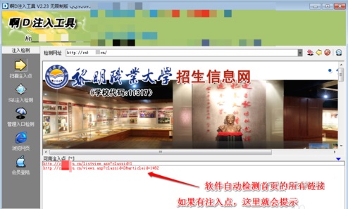 3、軟件下方會顯示檢測到當前頁面的注入點,如果首頁沒有,可以換其他頁面,可在網(wǎng)頁上點擊進入其他頁面,點擊進入網(wǎng)站各個欄目,看看各個頁面是否有注入點。。