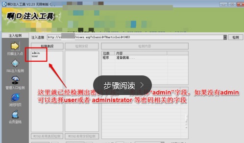 8、這里就已經(jīng)檢測出了賬號密碼相關(guān)表段,一般首選“admin”或者“administratior”或者user等管理員賬號敏感字符。