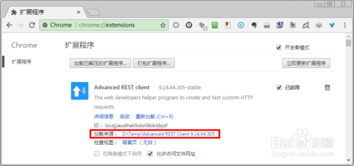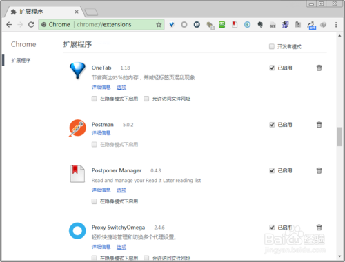 在打開的Chrome瀏覽器的擴展管理界面中,可以看到已經(jīng)安裝的Chrome擴展程序。