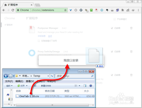 找到已經(jīng)下載到的Chrome離線擴展程序安裝文件xxx.crx,然后將其從資源管理器中拖拽到Chrome的擴展管理中,這時候用戶會發(fā)現(xiàn)在擴展程序界面中會多出一個"拖放以安裝"的信息提示。