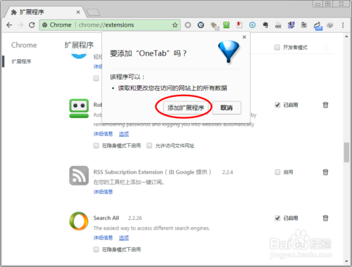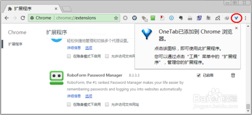 點擊添加按鈕就可以把該離線Chrome擴展程序安裝到Chrome瀏覽器中去,安裝成功以后該擴展程序會立即顯示在瀏覽器右上角(如果有擴展程序按鈕的話),如果沒有擴展程序按鈕的話,用戶還可以通過Chrome擴展管理器找到已經(jīng)安裝的擴展程序。