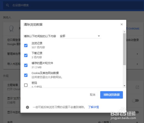 點擊上圖2中的“清除瀏覽數(shù)據(jù)”,瀏覽器將彈出設(shè)置頁面中“清除瀏覽數(shù)據(jù)”的對話框,如下圖所示。
