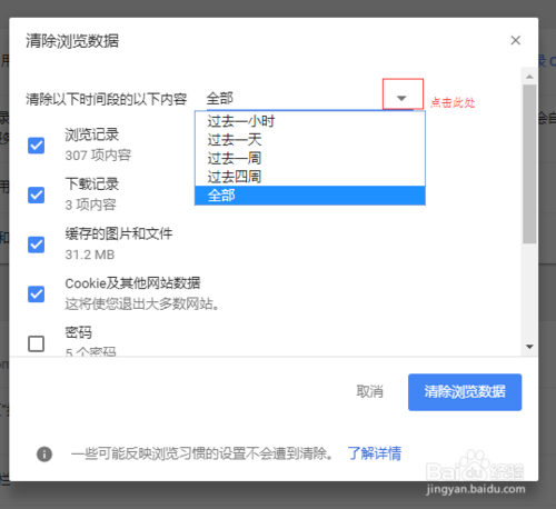 首先請先選擇要清除的時間段,默認是“全部”,點擊下圖中標紅的箭頭,可以看到其他選項,請根據(jù)自己的需要選擇不同的時間段。