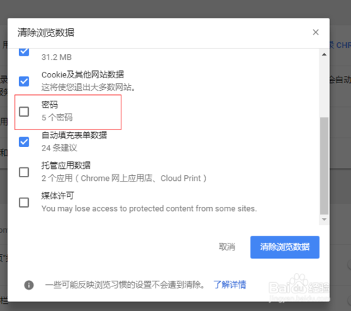 在勾選清除內(nèi)容的時候,請注意以下截圖中標紅的項,如果把“密碼”選擇勾上,那所有的網(wǎng)頁的用戶名和密碼將會被清除,所以在勾選這一項的時候請慎重,如果清除了,導(dǎo)致登錄某些網(wǎng)站要重新輸入密碼。