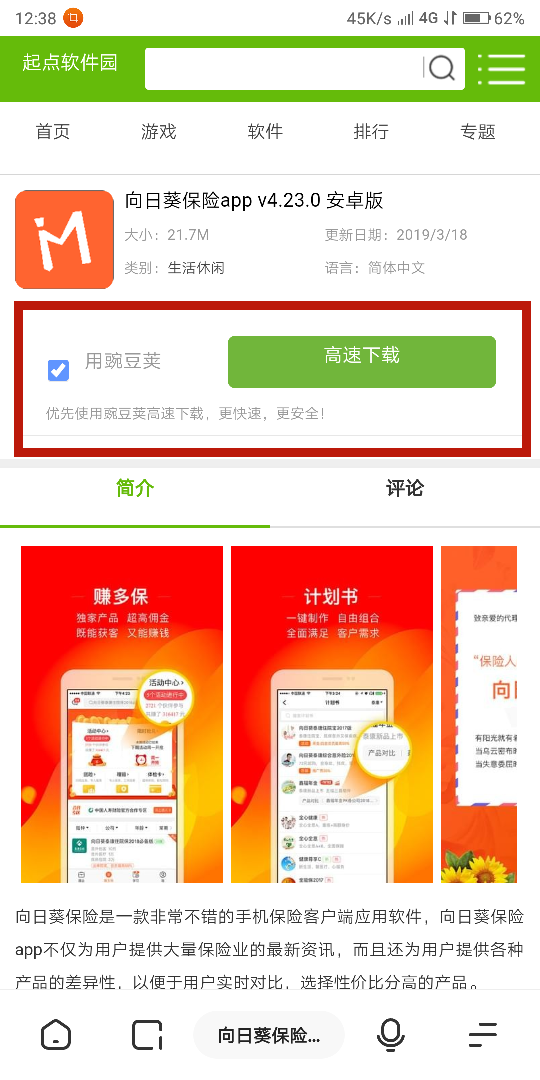 2.進(jìn)入起點后搜索向日葵保險,選擇第一個進(jìn)入下載頁面