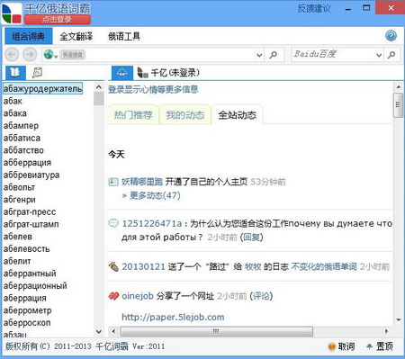 千億俄語詞霸官方版提供一站式查詢平臺(tái),支持多語種網(wǎng)絡(luò)全文翻譯。全文翻譯新增查詢選中詞的功能,在原文框或解釋框內(nèi)雙擊查詢?cè)~,即可在千億詞庫內(nèi)查詢,得出精確的結(jié)果。通過網(wǎng)絡(luò)查詢最新翻譯,無限容量詞庫,翻譯永不過時(shí)。千億詞霸涵蓋了大量的俄語資訊、俄語時(shí)事新聞、語法、口語、日常俄語、俄語導(dǎo)游詞等資料,是國(guó)內(nèi)最全的俄語學(xué)習(xí)網(wǎng)站。【功能詳情】
