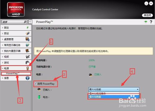 3、點(diǎn)擊【電源】選擇【PowerPlay】再選中【啟用PowerPlay】擇最后選擇【最大化性能】