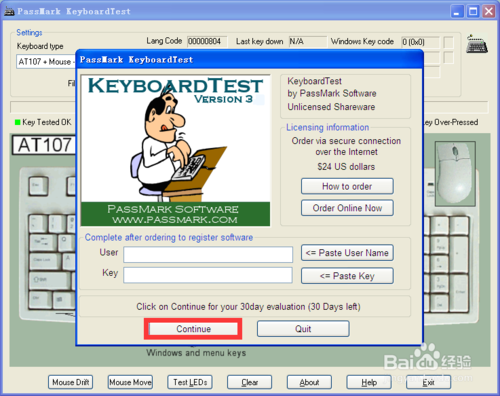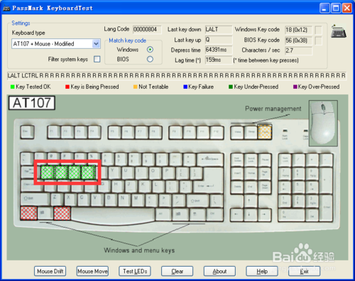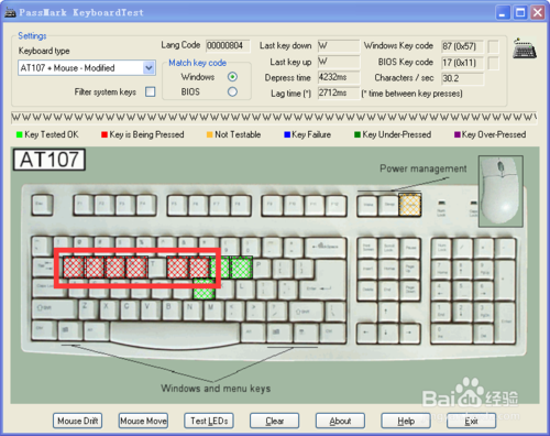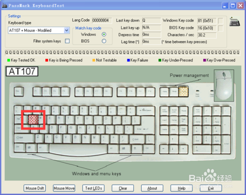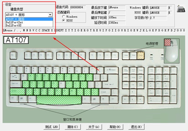 KeyboardTest的全稱為PassMark KeyboardTest,它是一款非常小巧實用的鍵盤好壞測試工具。它能夠在最短的時間內(nèi)幫助你檢測出鍵盤的鍵位是否好用以及鍵盤所有的按鍵狀態(tài)、按鍵的可用時間、顯示BIos、widows鍵盤掃描碼等等鍵盤的參數(shù)。此外它還可讓用戶自定義鍵盤布局,檢測鼠標(biāo)的按鍵效果哦和反應(yīng)時間,全面支持AT107(標(biāo)準(zhǔn)鍵盤),Dellport int和DellportUS(筆記本鍵盤)等多種鍵盤類型。