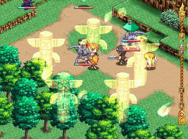本游戲的戰(zhàn)斗方式是回合制的仿真戰(zhàn)術(shù)戰(zhàn)斗。借著地形高低落差概念的導(dǎo)入,而對(duì)移動(dòng)范圍及攻擊力等等發(fā)生不同程度的影響。更具特色的是特技與魔法系統(tǒng)。游戲中的角色需由場(chǎng)景的地形中吸取出稱為元素的大自然能量,而消耗在特技與魔法的使用上。例如黃色元素需自地面抽出,而青色元素需由河川抽出等等。當(dāng)然每個(gè)不同的角色都有其獨(dú)自的特技或魔法,消耗的元素也各有所不同,并且有時(shí)會(huì)因?yàn)榈匦蔚南拗贫鵁o法使用需要的元素,以致于實(shí)力無法得到發(fā)揮,這些都是在進(jìn)行游戲時(shí)必須考量的因素。