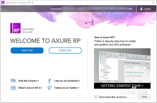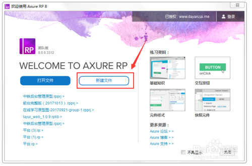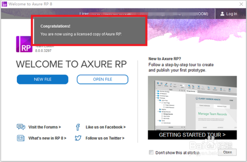 第五步,祝賀信息。這時(shí)在歡迎頁中會(huì)呈現(xiàn)“Congratulations! You are now using a licensed copy of Axure RP.”的祝賀信息,這說明激活成功,如下圖所示: