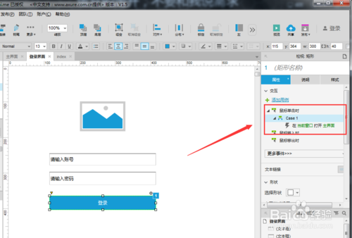 添加事件需要先點(diǎn)擊你要添加事件操作的組件,然后再點(diǎn)擊屏幕右上方的屬性窗口,然后你就可以看到有很多種事件操作,有鼠標(biāo)單擊、鼠標(biāo)移入、鼠標(biāo)移出: