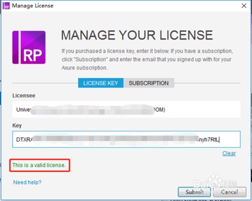 第四步,輸入許可。在許可管理頁中的License和Key的輸入框中分別輸入,輸入完畢后如果左下角出現(xiàn)“This is a valid licence.”(這是一個(gè)有效的授權(quán))的字樣說明激活碼有效,然后點(diǎn)擊“submit”(提交)按鈕,如下圖所示: