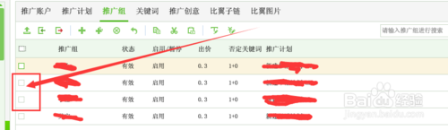 3、打開(kāi)單元后,也就推廣組之后就可以選擇你要添加否詞的單元,當(dāng)然你也可以選擇上面的那個(gè)方框進(jìn)行全選,