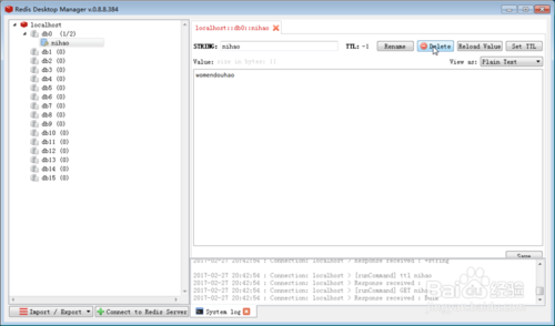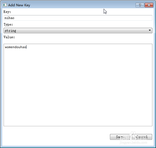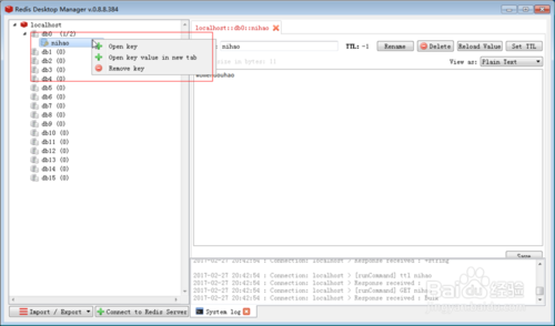 然后你可以雙擊那個(gè)Key(nihao),它會(huì)在右側(cè)的部分將Key 與 Value都展示出來(lái),并且對(duì)Key有一些相應(yīng)的操作。我們也可以在Key上右鍵單擊,彈出的對(duì)話框中依然會(huì)有一些對(duì)應(yīng)操作。