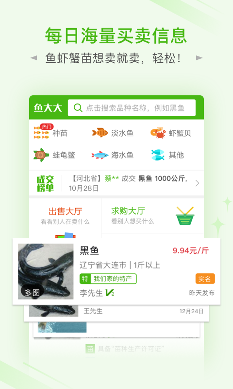 魚大大app非常適合這四類人,養(yǎng)殖戶,中介人,求購者,同行業(yè)務(wù)技術(shù)精英。