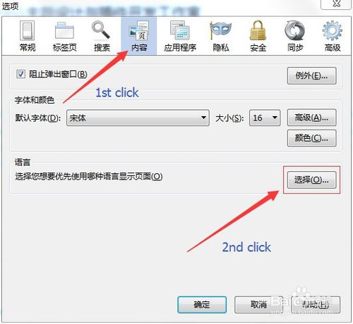 3、打開(kāi)“選項(xiàng)”后,選擇對(duì)話框上首的“內(nèi)容”,再點(diǎn)選“語(yǔ)言”設(shè)置項(xiàng)的“選擇”。