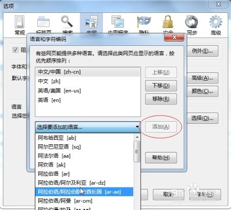 4、打開(kāi)“選擇”對(duì)話框后,可以選擇設(shè)置已經(jīng)安裝的語(yǔ)言為首選語(yǔ)言,如果沒(méi)有安裝,可在“選擇要添加的語(yǔ)言”下拉選項(xiàng)中選中你要添加的語(yǔ)種,并且點(diǎn)擊右側(cè)“添加”按鈕,然后“確定”。