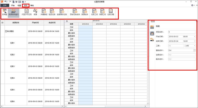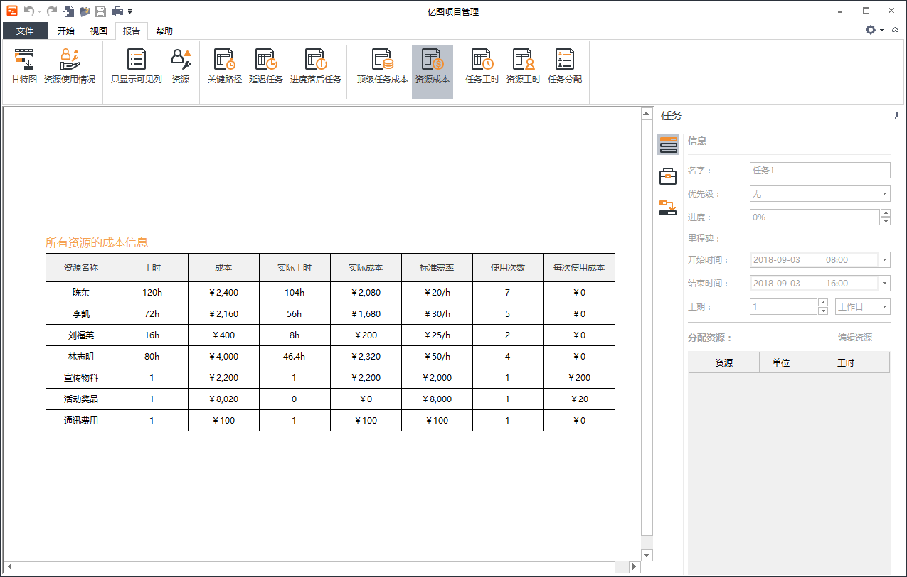 除此之外,點(diǎn)擊菜單欄上方的“報(bào)告”,還可以查看資源成本的使用情況以及任務(wù)工時(shí)、延遲任務(wù)、任務(wù)分配等信息。