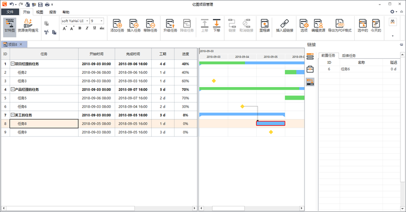 如果你想添加里程碑的子任務(wù),只需要選中項(xiàng)目,然后點(diǎn)擊上方的“降級(jí)任務(wù)”,即可將選中的項(xiàng)目變成子任務(wù)。如果你想添加前置任務(wù)或后續(xù)任務(wù),選中項(xiàng)目后,在右側(cè)的“鏈接”選項(xiàng),將前置或后置任務(wù)的ID輸入,即可將其進(jìn)行連接。