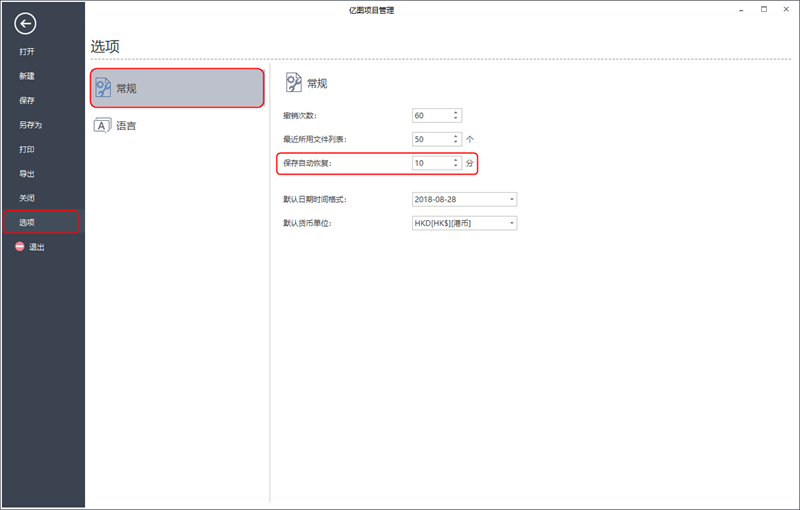 4.在【選項(xiàng)】–【常規(guī)】中,你可以根據(jù)自己的需求設(shè)置Edraw Project項(xiàng)目管理軟件的自動(dòng)備份時(shí)間間隔。