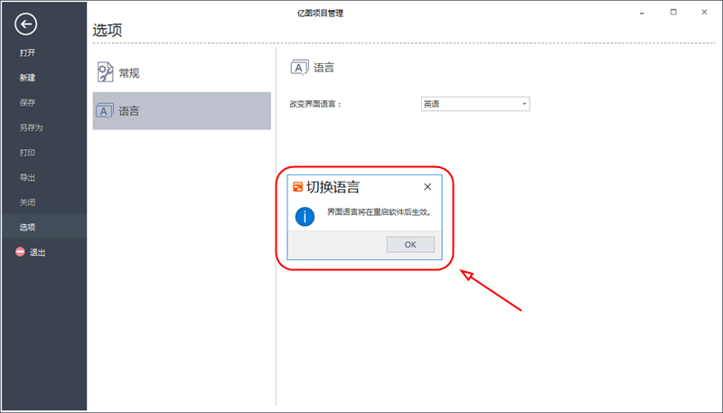 5、選中需要修改的語言后,會(huì)彈出一個(gè)提示框,點(diǎn)擊“OK”,并根據(jù)提示重新啟動(dòng)軟件。