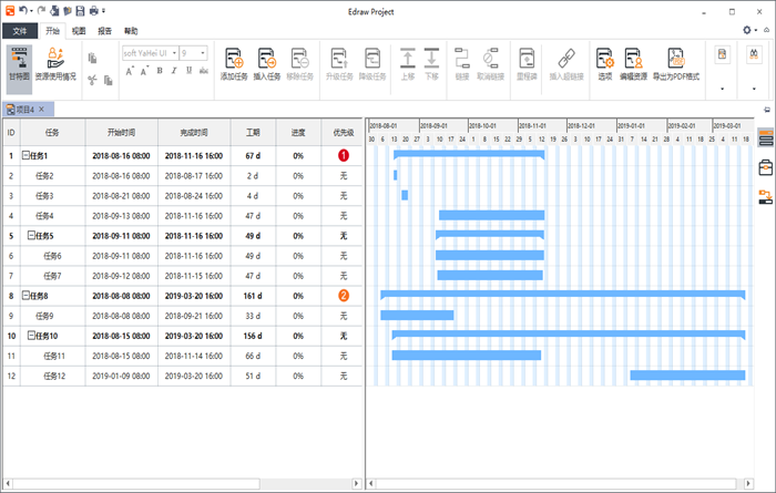 甘特圖是項(xiàng)目管理領(lǐng)域里,最為常用的一種圖示。因此,我們可以使用Edraw Project繪制甘特圖。在繪制甘特圖的過程,你將學(xué)會(huì)如何新建甘特圖,如何添加任務(wù)信息,如何生成各類報(bào)表等。
